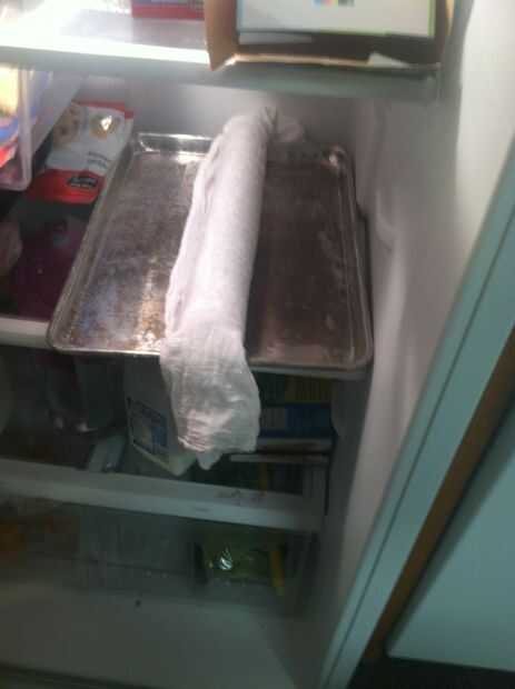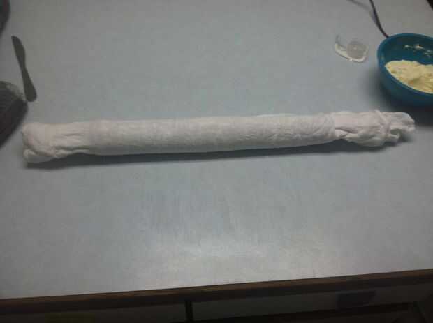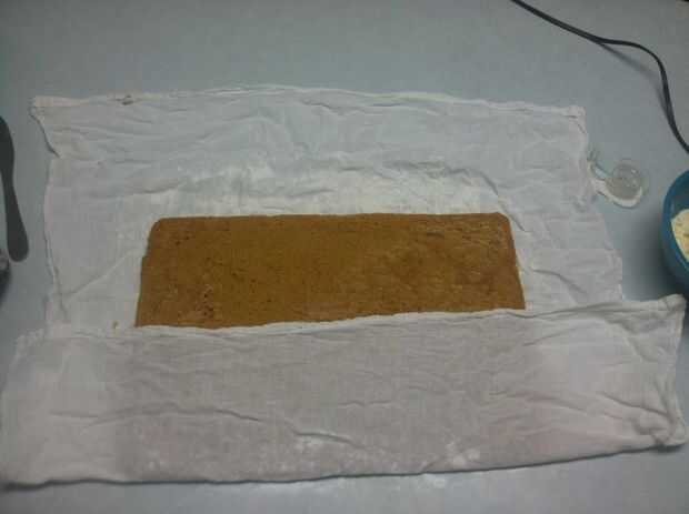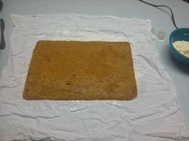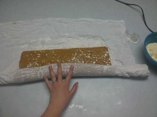 Poco a poco comenzar a rodar el rollo de calabaza en una espiral apretada. Evitar tanto espacio como pueda entre las capas de rodillo. Al completar el rollo, envolver la tela restante alrededor hasta que el paño se ha ido. Coloque el rollo de calabaza en la nevera durante 10 minutos. Esto evitará que el rodillo de enfriamiento en una posición "recta". Se endurecen en forma natural laminada.