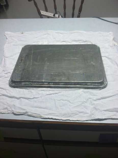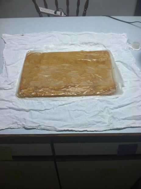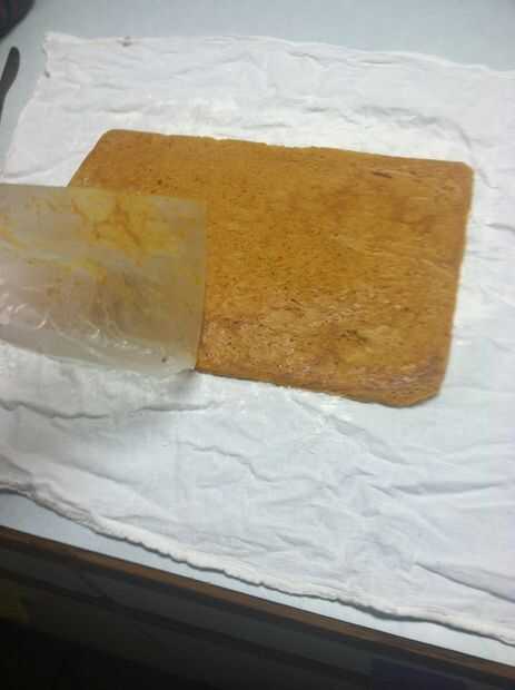 Levante la bandeja de la torta. Suavemente Retire el papel encerado de la torta. De vez en cuando, habrá poco rasgaduras o roturas, pero esto va a ser el "interior" del rollo de calabaza para que no se preocupe demasiado acerca de él.
