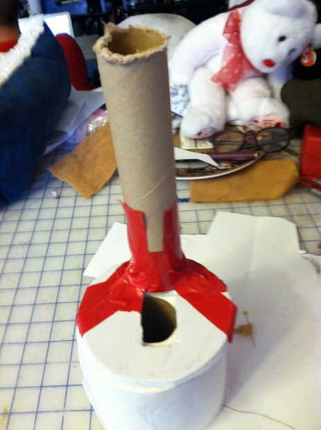 21. encontrar un grueso trozo de tubo de papel de desecho (yo usé un tubo de un rollo de tela) o un taco y corte a la altura del oso. A la pieza redonda de espuma de tipo de cinta hacia atrás un poco. No es una ciencia exacta. Básicamente, usted está haciendo una forma de mantener la forma del oso.
