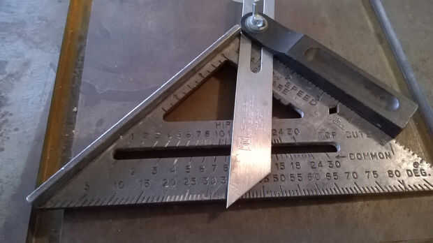 Los cortes están dispuestos en un ángulo de 55 grados. No tengo un transportador, por lo que utilicé una cuadrado de la velocidad y un bisel de calibre. Ya que no referencia el borde correcto de la plaza con el medidor, puse mi ángulo de 35 grados (el ángulo de conexión).