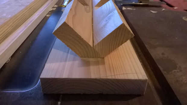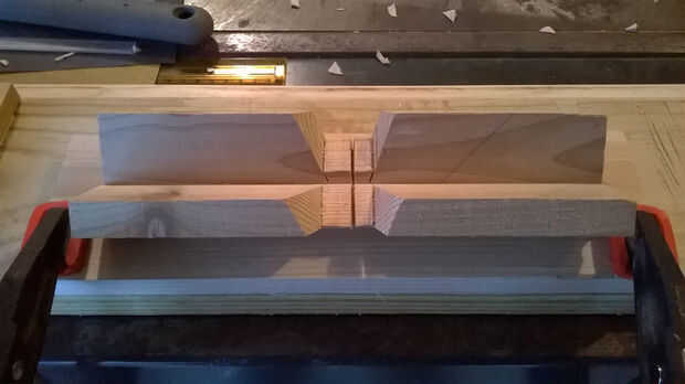 Hice esta cuna de chatarra. Como se puede ver, sólo arrancó el borde de una tabla a 45 grados y había unido a otro. Luego até esta cuna a una "base" más larga que pude pulsado con abrazaderas. Todo el conjunto es pegado y clavado juntos. Corté una sección en el medio para que mi cincel no clavan a los lados de la cuna. Estos recortes son al azar ángulos (no aprovecho esta cuna de la feria, después de todo), y corte el centro con una sierra de marquetería.
