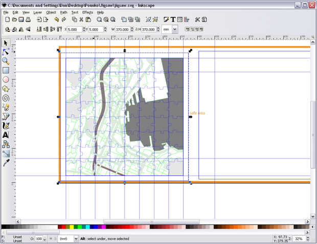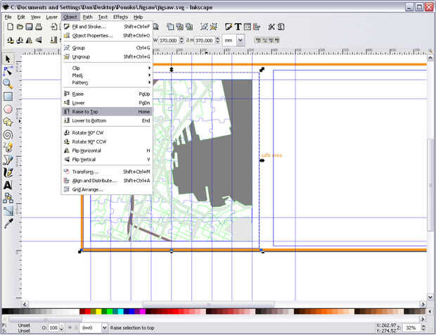 Con los pedazos del rompecabezas azul seleccionados, seleccione subir arriba en el menú objeto. La imagen 3 muestra el resultado con todas las líneas de corte visible.
