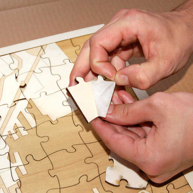 Este puzzle es muy fácil de hacer. Hay 6 piezas idénticas y hay unas maneras de hacer los cortes de las ranuras. Si usted quiere hacer un montón de estos rompecabezas muy rápidamente, podría configurar una plantilla en la Sierra de mesa o sierra de c