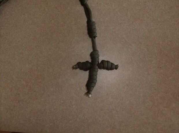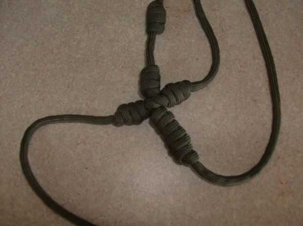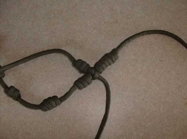 La Cruz está hecha del mismo tipo de los nudos que hemos estado utilizando.  Prefiero los brazos y parte superior mitad de la longitud de la parte inferior la mitad con cuatro y ocho.  Se puede cambiar según su preferencia.  En primer lugar hacer un nudo con cuatro lazos, no apretar demasiado todavía.  Entonces forman un nudo con lazos de ocho.  Apriete estos dos nudos para que queden bien uno contra el otro.  Cerca de cinco pulgadas desde el extremo del lazo de nudo ocho cuatro otro lazo este ser uno de los brazos.  Haz este nudo tan apretado y luego atar un nudo simple alrededor del vertical entre las porciones superiores e inferiores.  Con el primer brazo apretado contra el montante puede formar el brazo final de un bucle de cuatro nudo y apriétela contra el montante.  En este punto, cortar el cable sobrante y utilizar un encendedor para los extremos de la chamusquina.  Un método que mantiene los extremos limpios es usar un encendedor y manténgalo junto al final hasta que comience a derretirse y luego presione el nylon fundido contra un cubo de hielo.  Esto crea un extremo plano que no se salga el nudo.