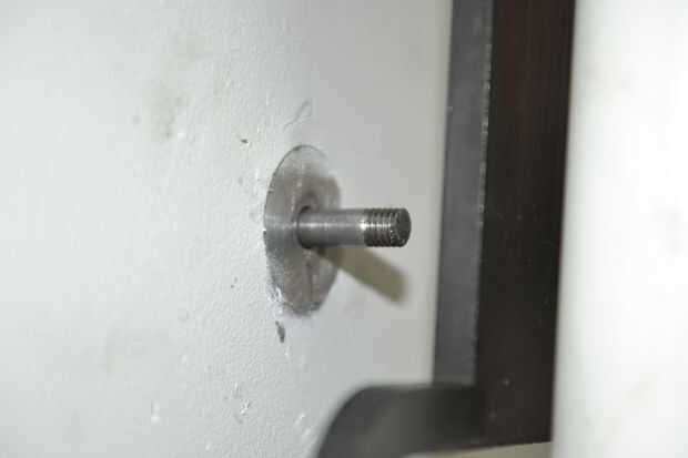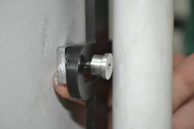 Hicimos 2 bujes de aluminio, usando un torno para darles forma. Uno se encajan en el tablero del forro. La forma precisa asegurado nuestro árbol permanecía en su lugar y crea menos fricción que simplemente perforar un orificio en el tablero MDF. El otro buje era más pequeño y estaba ensartado dentro. Montado en el pequeño tornillo en el extremo del brazo giratorio. Tiene un pequeño borde trabajado a máquina, que es más grande que el interior diámetro del canal del yugo escocés, evitando que se suelte. Las fotografías muestran que el buje grande colocado en el tablero (con el eje y el sombrero del buje del yugo giratorio de brazo y scotch de conexión.