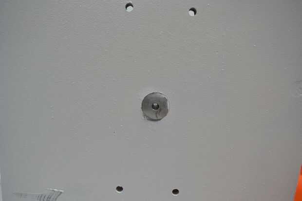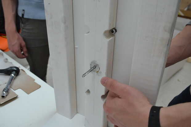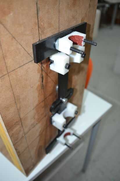 Hemos hecho un simple apoyo para sostener la bomba vertical. Consta de 2 hojas MDF en ángulo recto, formando una base y una superficie de montaje. Un gran agujero fue perforado en el centro de la superficie de montaje usando una broca fostner. Los agujeros para los tornillos de la bodega que también se perforaron las guías en su lugar. Con el fin de mejorar aspectos entonces pintada blanco de esta junta.