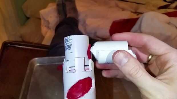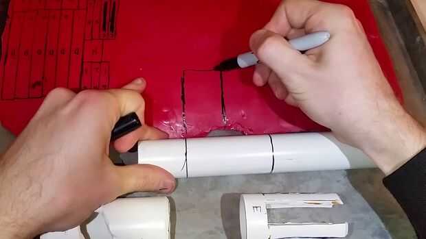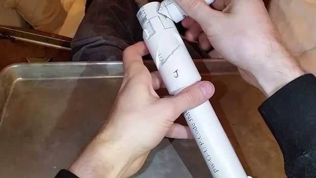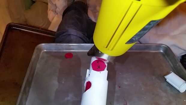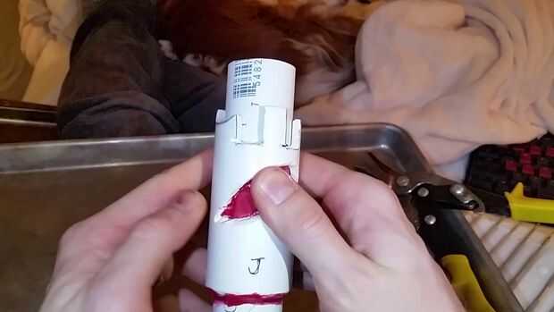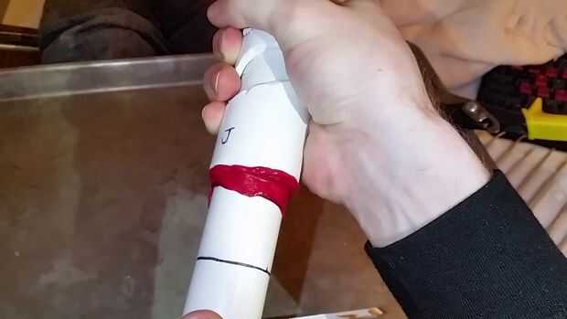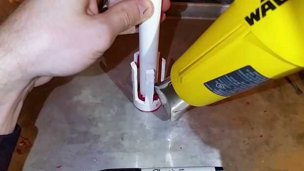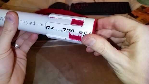 Ahora cortar tu K, se utilizará para "soldar" sus crossguards en la empuñadura. lugar de calor a través de todo el camino, y pega hacia el lado, si no pulse la tecla apretada, usted puede golpear los bordes puntiagudos del PVC con la pistola de calor hasta que se vuelve suave a continuación, puede presionar lo apretado hasta que se enfríe.
