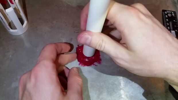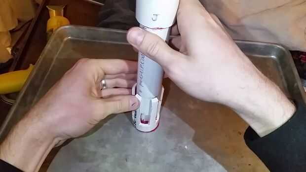 Hacia el pomo, coloque pequeños pedazos de plástico en el interior de cada una de las patas, cortadas 4 cuadrados de la hoja, aproximadamente la anchura de la base de su empuñadura, cortar una 9" longitud de tubería de PVC de 1/2", pulse el PVC en el centro de los 4 cuadrados climatizada, seguido por el pomo.