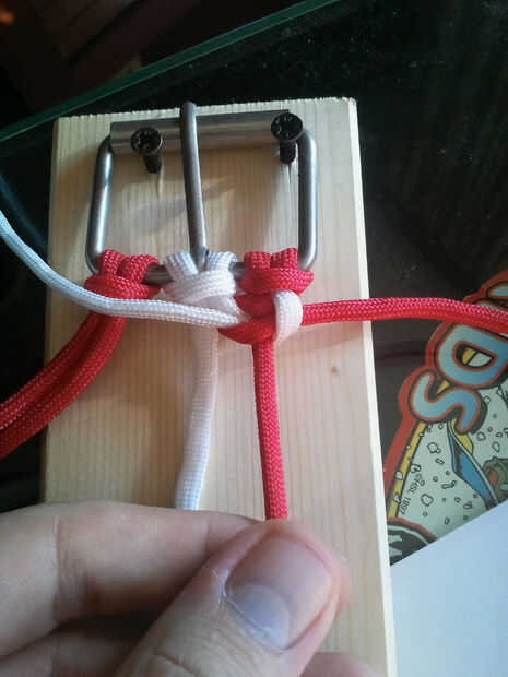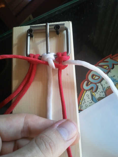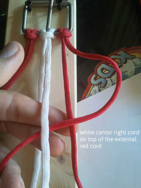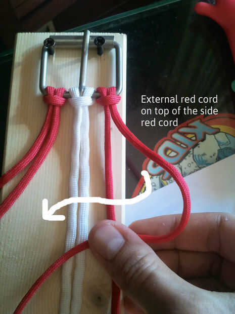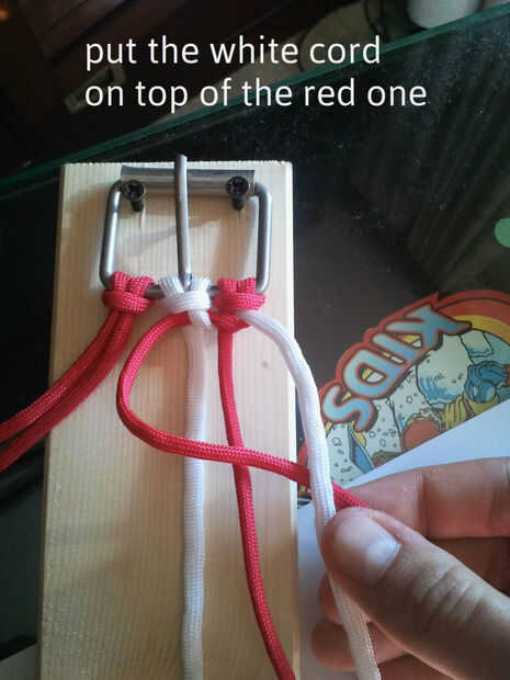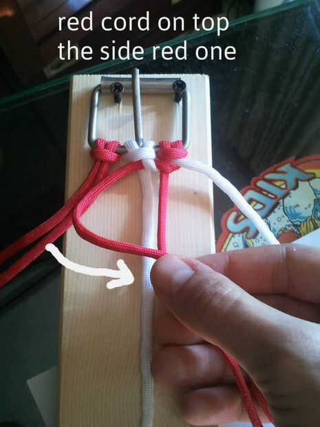 Así que vamos a empezar a tomar la cuerda roja derecha externa y poner encima el lado rojo.