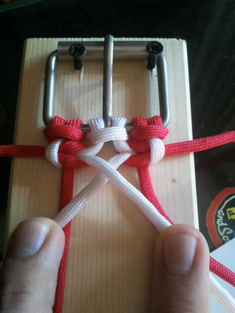 A partir de ahora, hasta el final del nudo, debemos recordar que, después de hacer el nudo de un lado a otro, antes de iniciar otro nudo, debemos cruzar el blanco central de la cuerda. así que el izquierdo va en la parte superior y el derecho de uno pasa por debajo y luego cruzarlos.