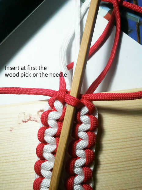 Ahora nosotros debemos insertar el cable en el lazo del nudo, y necesitamos la ayuda de la aguja de paracord (no lo tengo por eso estoy usando un palo de madera).