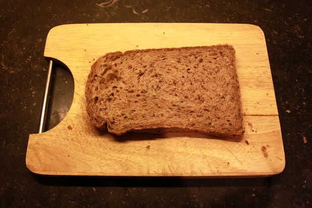 poner la rebanada de pan en la tabla de cortar