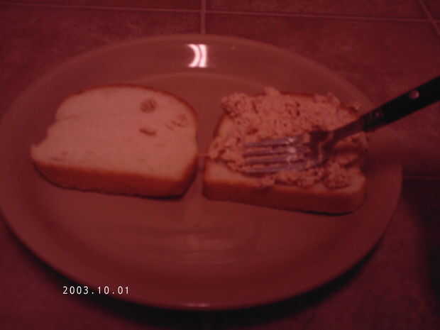 Pone dos rebanadas de pan en un plato.  Poner dos cucharadas pequeñas de la mezcla de atún en una de las rebanadas.  Extender y nivelar la mezcla de atún uniformemente hasta que ese segmento está cubierto casi por completo.