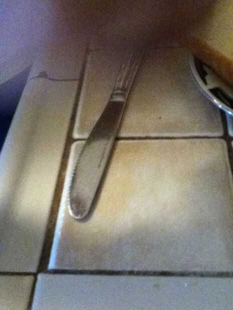 Tu cuchillo y separó la mantequilla de maní en una piezas de pan.