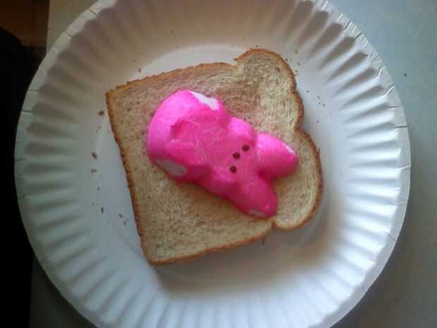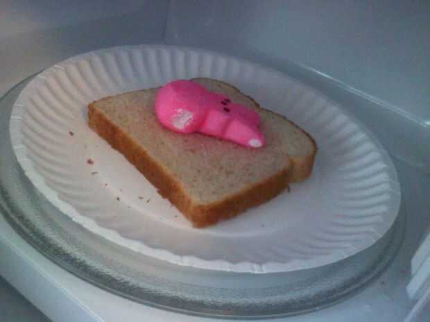 > Coloque la otra rebanada con Sr. Peep en el centro del plato giratorio sobre un plato de microondas seguro o algo