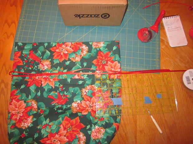OK, Ok, medir la anchura del bolso y múltiples x dos. Añadir la longitud de la cola de cinta x dos. Seis pulgadas siempre es un buen mínimo. (anchura x 2) + (6 "x 2). ¿Feliz?