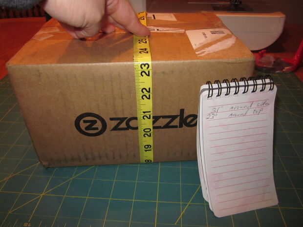 Como apenas pueden hacer en la foto de arriba, mi caja era 31" todo (S) por 23" de arriba a abajo (T). Por lo que fue mi fórmula (31"/ 2) + 2" = 17,5" para el ancho y 23" + (2 x 1") + (2 x 4") + 2 "= 23. 5" para la longitud. Así que necesitaba un pedazo de tela que fue 17,5 "x 23,5".