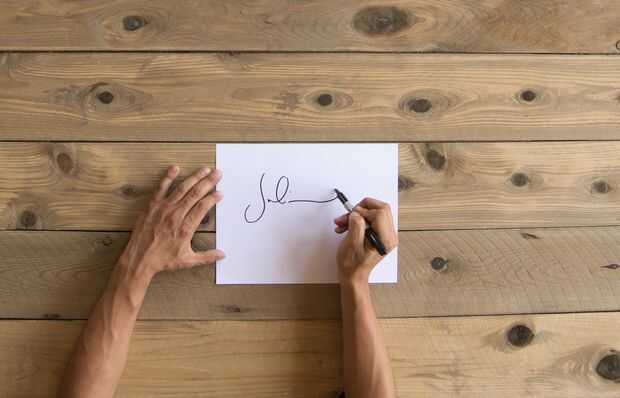 Use un marcador negro grueso para firmar su nombre en una hoja de papel blanco.