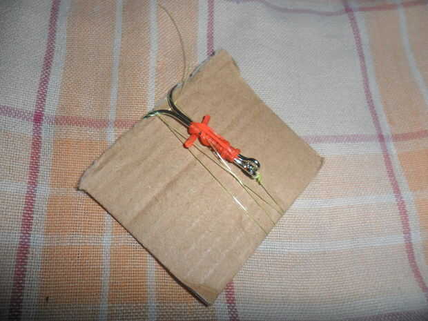 Aquí solo he añadido una línea y lo envolvió en un trozo de cartón. Si Envuelva la banda ronda bastante bien, este diseño debe ser capaz de retener a los peces hasta 5 libras o menos.