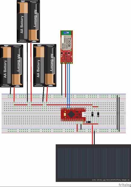 Las baterías y panel solar en paralelo y proporcionan energía para el procesador, con diodos de protección. El panel de carga las baterías cuando se puede suministrar corriente exceso de voltaje. Como se trata de un esquema simple de carga, lo que significa que sólo debe utilizar este diseño con pilas NMH porque pueden tomar la tensión de sobre y bajo carga. Los diodos son críticos para asegurar que el panel solar no sobre carga y control de tensión de salida.