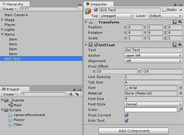 Establece la transformación del texto de la interfaz gráfica de usuario para (0.1.0) y darle un desplazamiento de píxel de (10, -10) en el componente GUIText en el panel Inspector.