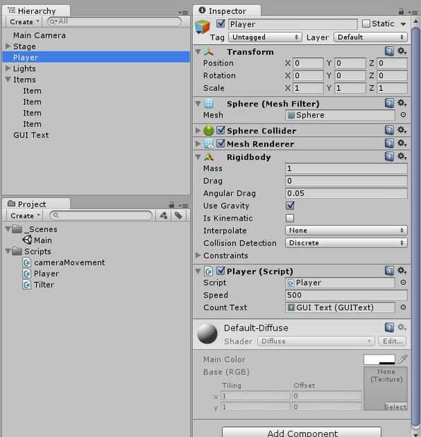 Abrir el script de movimiento del jugador desde el panel Inspector con el objeto de juego de jugador seleccionado, modificar el script para permitir al jugador recoger y hacer un seguimiento de, los elementos que ha reunido.