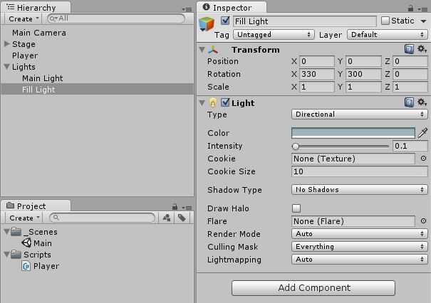 Atenuar la intensidad de la luz llene cambiando el color a un ligero tinte azul y reduciendo el campo de intensidad en 0,1 (en el Inspector).