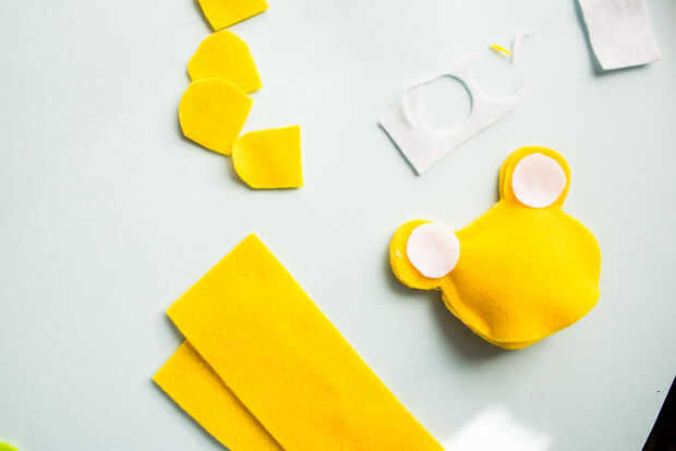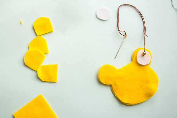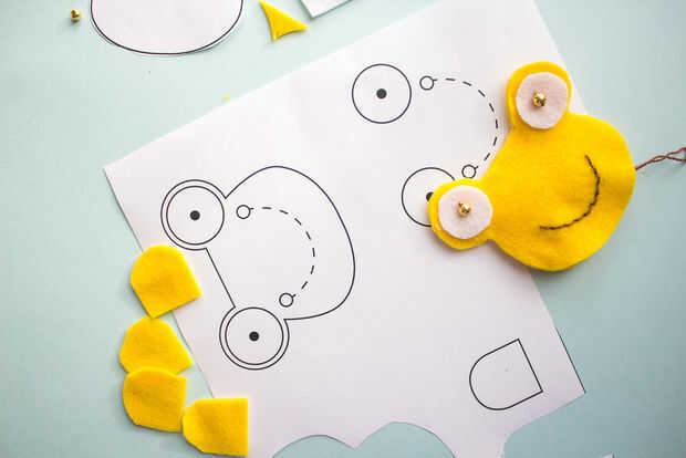 Pega el círculo de los ojos a la cara del sapito. Cose las perlitas en el centro de cada círculo. Borda la boca al sapito con puntadas simples.