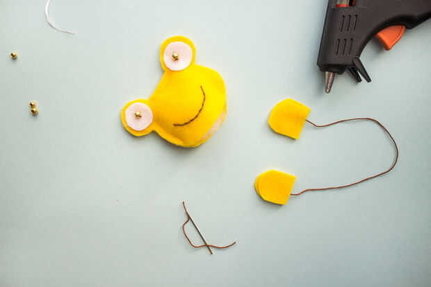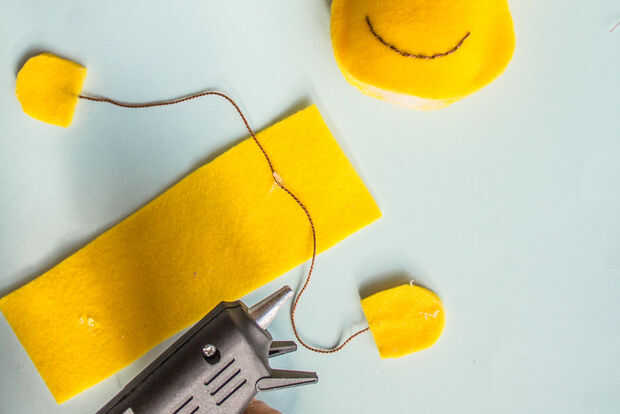 Corta dos hilos de 7'' cada uno para los brazos y pies. En cada extremo, pega las manitos y piecitos. Pega los brazos en el rectángulo 2'' del extremo superior. Tratar el mismo esté centrado.