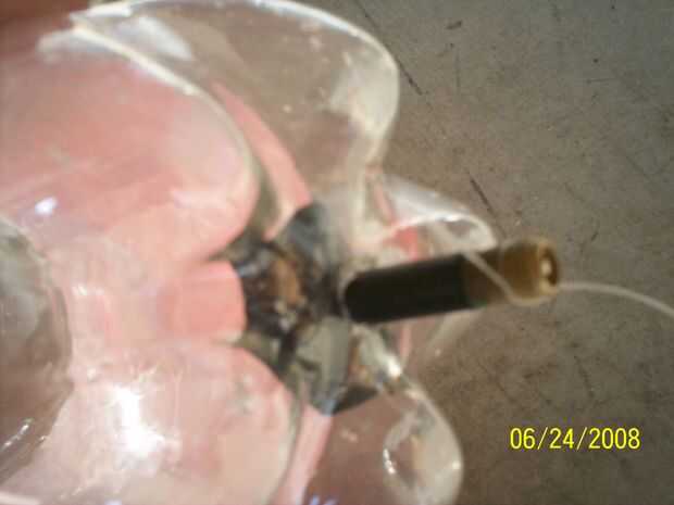Tome el taladro y buscar un poco que es un poquito menor que la válvula scrader. Perfore un agujero en la parte inferior de la botella. toma un pedazo largo de la línea de pesca y amarre en la parte superior de la schrader. Pegue la línea de pesca a través de la parte superior de la botella y hacer que viene hacia fuera de los agujeros que ha perforado. Tire de la schrader en su lugar. (como en la imagen) Elimine la línea de pesca. Puede epoxi la parte inferior de la schrader, Dónde está el agujero, para detener fugas. Si usted no epoxy que sólo poner en algunos cemento de pvc.