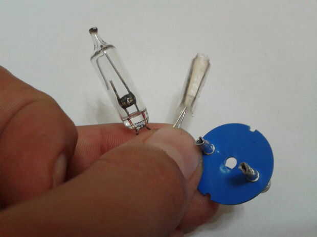 Abrir cada tubo metálico apretando los tubos con la ayuda de los alicates como se muestra, a continuación, tire de los cables de los tubos metálicos para conseguir la lámpara hacia fuera con la ayuda de los alicates, después de abrirlo, tome la lámpara y esta cosa de plástico hacia fuera como se muestra, después lanzar esta cosa de plástico y tapa de plástico a la forma, no necesitamos más.