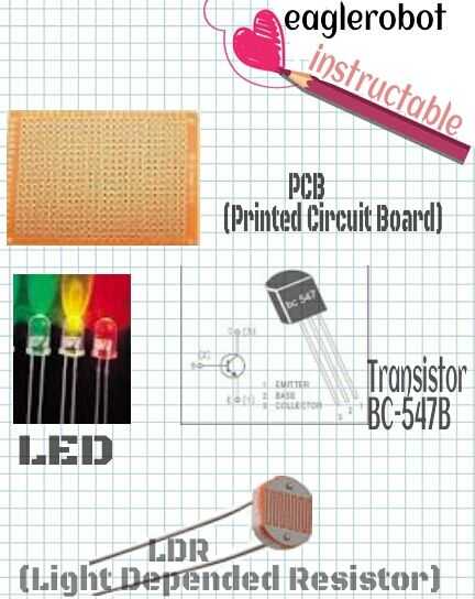 1.Battery (3v-4.5v) 2 LDR 3 Transistor (NPN BC547B) 4 LDR 5 LED