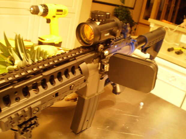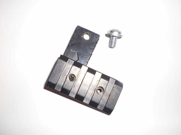 Si tienes el JG m4 o cualquier otra pistola sin un riel lateral largo, querrá quedarse para esto agregue extra en que se agregan para un mejor efecto. Tome su pequeño carril RIS y su pedazo de plástico durable y enroscarlas formando juntos una forma de "L". Perfore un agujero lo suficientemente grande como para caber el tamaño de tornillo, necesitará montar el rifle de aire como se muestra.