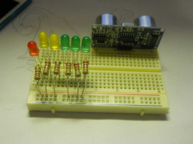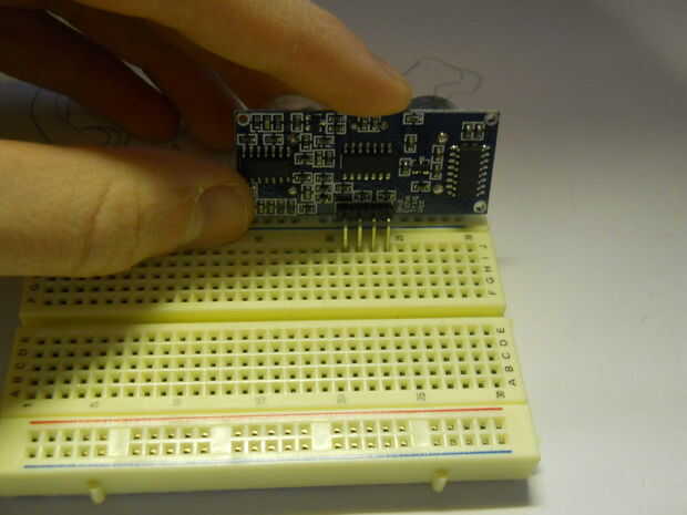 En primer lugar, coloque el sensor de distancia de un extremo de la placa para que ninguno de los pines están conectado (generalmente paralela a los carriles exteriores).