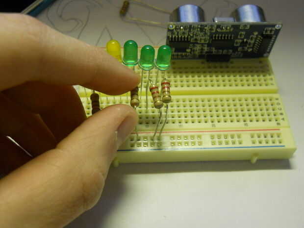 Luego coloque el LED en el orden de izquierda a derecha: verde, verde, verde, amarillo, amarillo, rojo