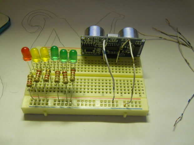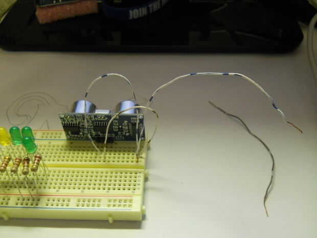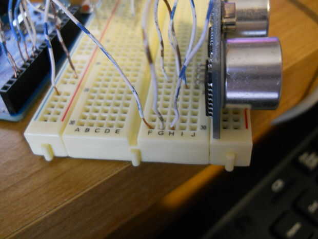 Los pines marcan TRIG y ECHO se puede colocar en otra columna para combinarlos. A continuación, agregar un cable conectado a la misma columna en uno de los extremos pero no la otra. Esto más tarde se conectarán a arduino, pero no en este paso.