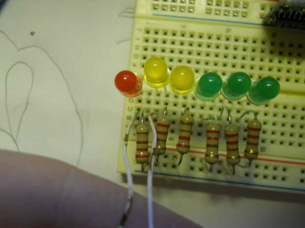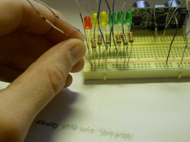 Conecte un cable a la patilla larga en cada LED. Más tarde estos estará conectados a arduino, pero no en este paso.