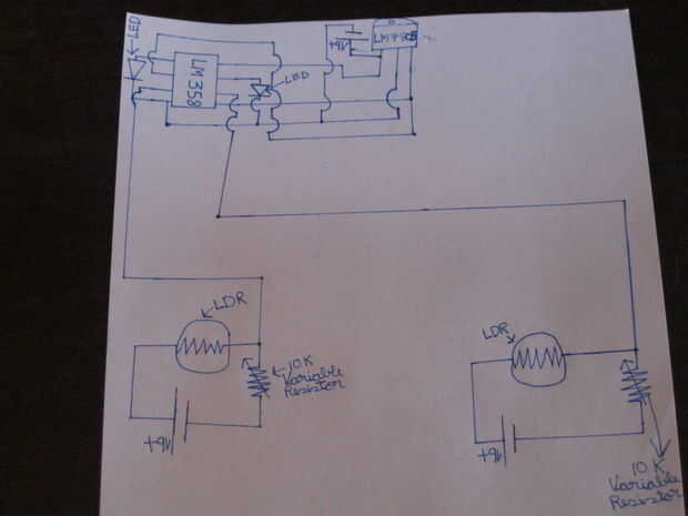 Conecte el primer terminal de la LDR al terminal positivo y el segundo a través de la variable resistencia negativa. Luego iniciar diferentes y cuando usted consigue un vary por ejemplo (v.58 a 1.1v) o si se los vary es de buena gama, también funcionará el circuito. Después de que un alambre en el medio de LDR resistor variable y y en el tercer pin del LM358 CI.