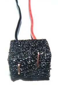 Meter dos cables en la espuma.  Asegúrese de no tocar los cables y hay un poco de una brecha entre los dos así que cuando aplastado no toque.  Para asegurarse de que los cables no salen mientras está en uso, asomó el cable todo el camino a través y doblado a los extremos.