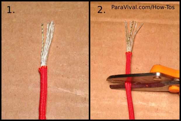 1. Asegurarse de que el final de su paracord no fundido cierre y tire del interiores filamentos, o agallas, a aproximadamente una pulgada.