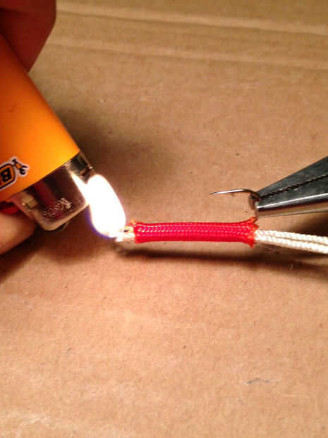 Asegúrese que el gancho de ojo en el extremo del gancho está expuesto. No derrita el paracord en él.