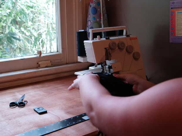 Utilizo mi overlocker para este paso, pero cuando no tengo una overlocker disponible utilizar una puntada de zig zag en una máquina normal de coser. Con el tejido elástico de la camiseta en la parte superior y la tela de la falda en la parte inferior estira a la tela de la camiseta de costura de pin uno al otro para que coincida uniformemente con la tela de la falda y coser en su lugar. Quite los pernos y repita con el otro lado. Cuando se han cosido la banda en la falda terminada tendrá un leve se reúnen donde la falda reúne la banda - esto desaparecerá cuando la falda es en el cuerpo y la banda se estira sobre la cadera/cintura.