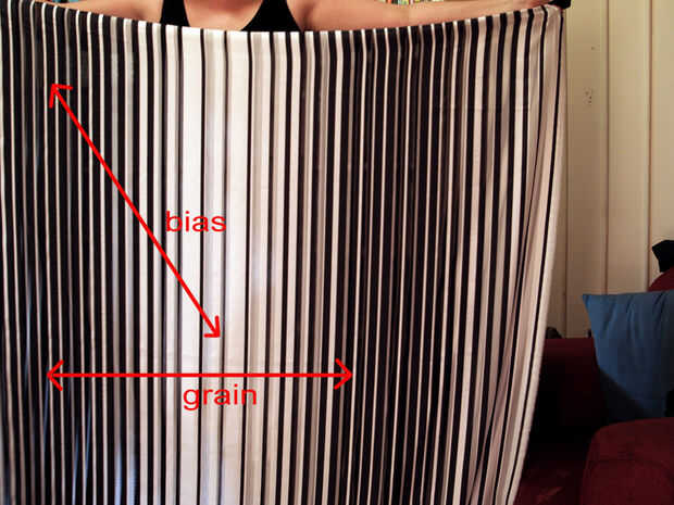 Para realmente acentuar el sesgo en esta demostración que he optado por usar a una tela con un patrón de rayas de maneras de longitud. Como puedes ver en el acabado final rayas arriba en diagonal al corte en sesgo la ropa.