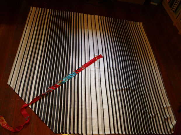 Pone el tejido patrón de la tira perpendicular al corte hecho en el paso anterior. El siguiente paso es recortar la falda vestida en una forma como que se muestra en la segunda foto, usted puede recortar esta como se muestra, aunque he encontrado mucho más fácil conseguir una forma simétrica doblando la falda pieza por la mitad hasta que el borde una (como showm en cuadro 2) se alinea con el borde b.