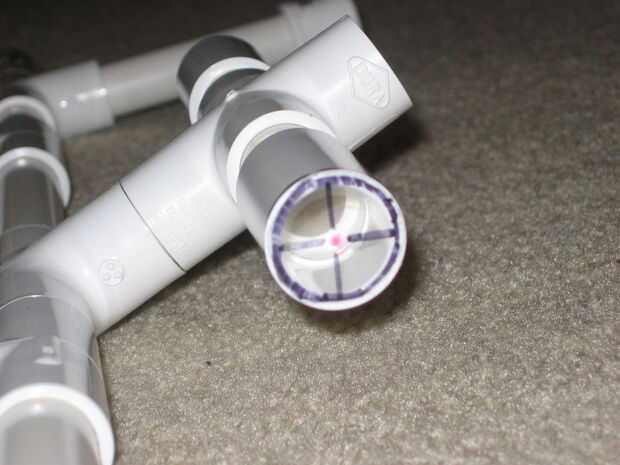 Conseguir cualquier tubo (no el acoplamiento, pieza T o esquina) y ponerlo en el plástico. Use un rotulador para hacer un círculo en el plástico. Recorta el círculo y use marcadores de colores diferentes o sharpies para hacer un espectáculo de alcance. Hice sólo una cruz normal con un punto rojo en el medio. Luego pegar este vista alcance a un extremo del acoplamiento. Debe encajar derecho encima de ella, entonces póngala a un lado. Empezaremos desde la parte inferior de la parte superior y el otro tubo de 1,5 pulgadas a la derecha (que va a conectar la parte del ámbito de aplicación al resto de la pistola. Consigue un trozo de T y Voltéela boca abajo, luego agregar un tubo de 1.5 pulgadas (cinta de la parte inferior del tubo e introdúzcalo) en la parte superior. Luego añadir la pieza de intersección (o la pieza T opcional). Conecte ambos el 1.5-2 pulgadas pedazo de piezas a ambos lados de la intersección. Luego conecte el acoplamiento no pegado a la izquierda y la pieza de scopesight pegado a la derecha. Entonces es su alcance. Sólo asegúrese de que se incline hacia el lado un poco como un verdadero AUG