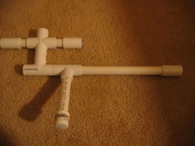 Comenzar con la pieza de T. Vamos a hacer una segunda manija! Añadir al tubo de 4.5 pulgadas (cinta en la parte superior) en la parte inferior de la T y una gorra por debajo de eso. Luego añadir el tubo de 8,5 pulgadas a la derecha y acabar con el último acoplamiento.