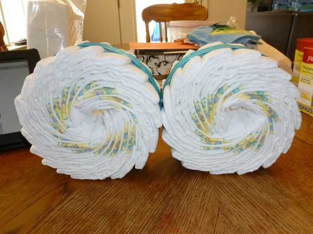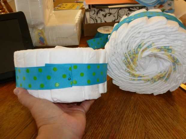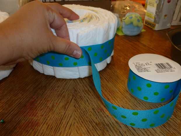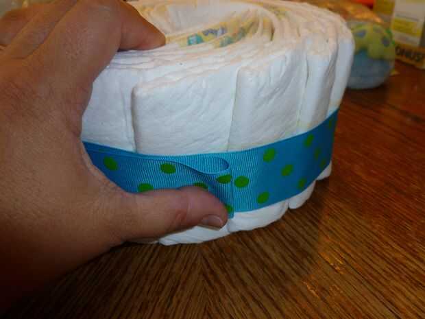 Utilizando uno de los alfileres de coser, prender las tres capas de cinta en el pañal.