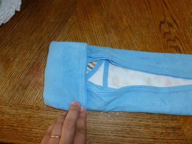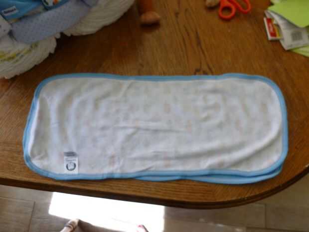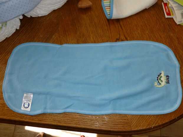 Después de doblar la combinación de las telas de eructo y baberos en un "asiento", he puesto ese pequeño paquete sobre el área donde se encuentran los neumáticos de dos pañales.