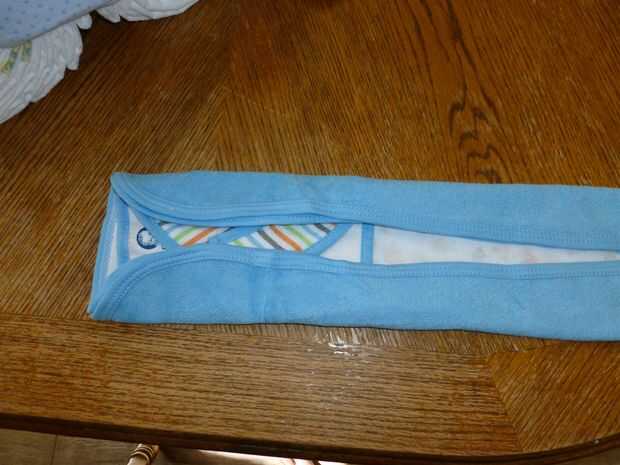 Me apilan los restantes paños burp encima de la otra y colocar el babero en un extremo de la pila. Luego procedí a doblar los extremos sueltos de los paños del burp hacia el centro para tener bordes aseados.