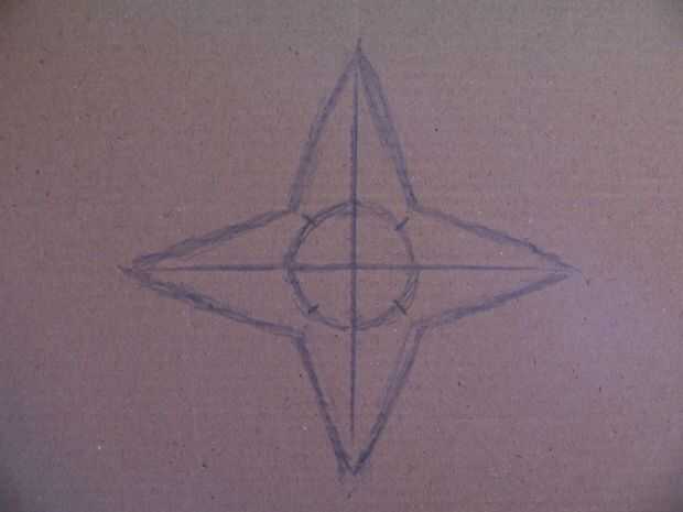 Ahora dibuja el contorno áspero de tu shuriken. Utilice las líneas cruzadas para hacer los puntos de lanzamiento de la estrella. Las líneas pequeñas que sobresalen del círculo que sea más fácil encontrar el medio donde los dos a fin de mes. Asegúrese de que cada punto es similar en longitud. Sé que no soy la mejor en esto, pero al final le resultan bellas.